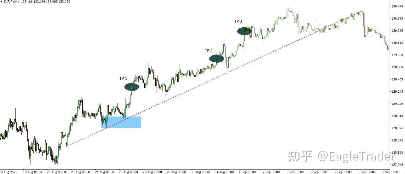 交易者在 128.8 价位买入欧元 / 日元(EURJPY),止损设为 25 点,仓位为 4 手。若交易失败,亏损为 880 美元(账户规模 10 万美元时,亏损小于 1%)。首个止盈位设为 50 点,到达时平仓一半(2 手)。